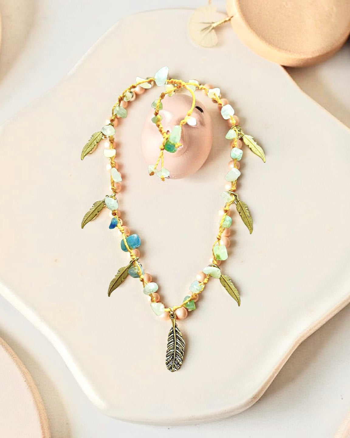 Delicado e envolvente, este colar é confeccionado com pedras cascalho de amazonita natural, cristal associado à serenidade, equilíbrio emocional e à energia calmante das águas.