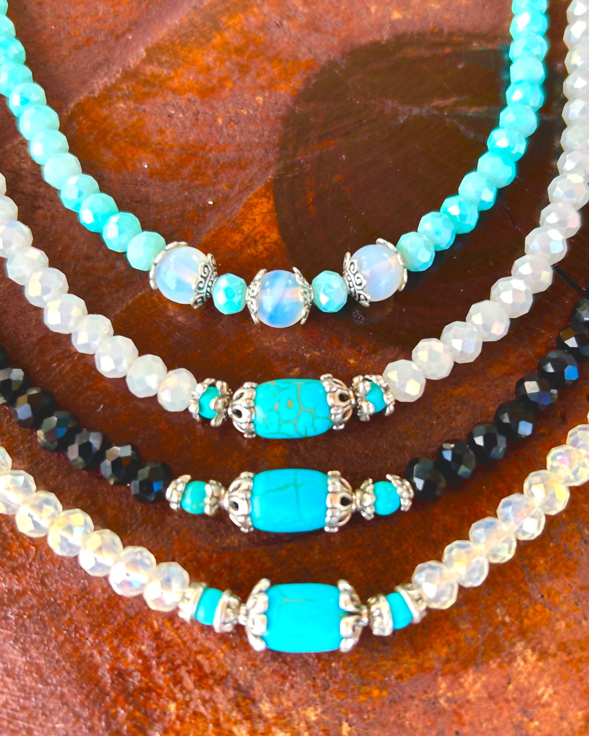 A fusão entre o brilho sofisticado dos cristais de vidro e a força bruta das pedras naturais dá vida ao colar Alma em Cristal.