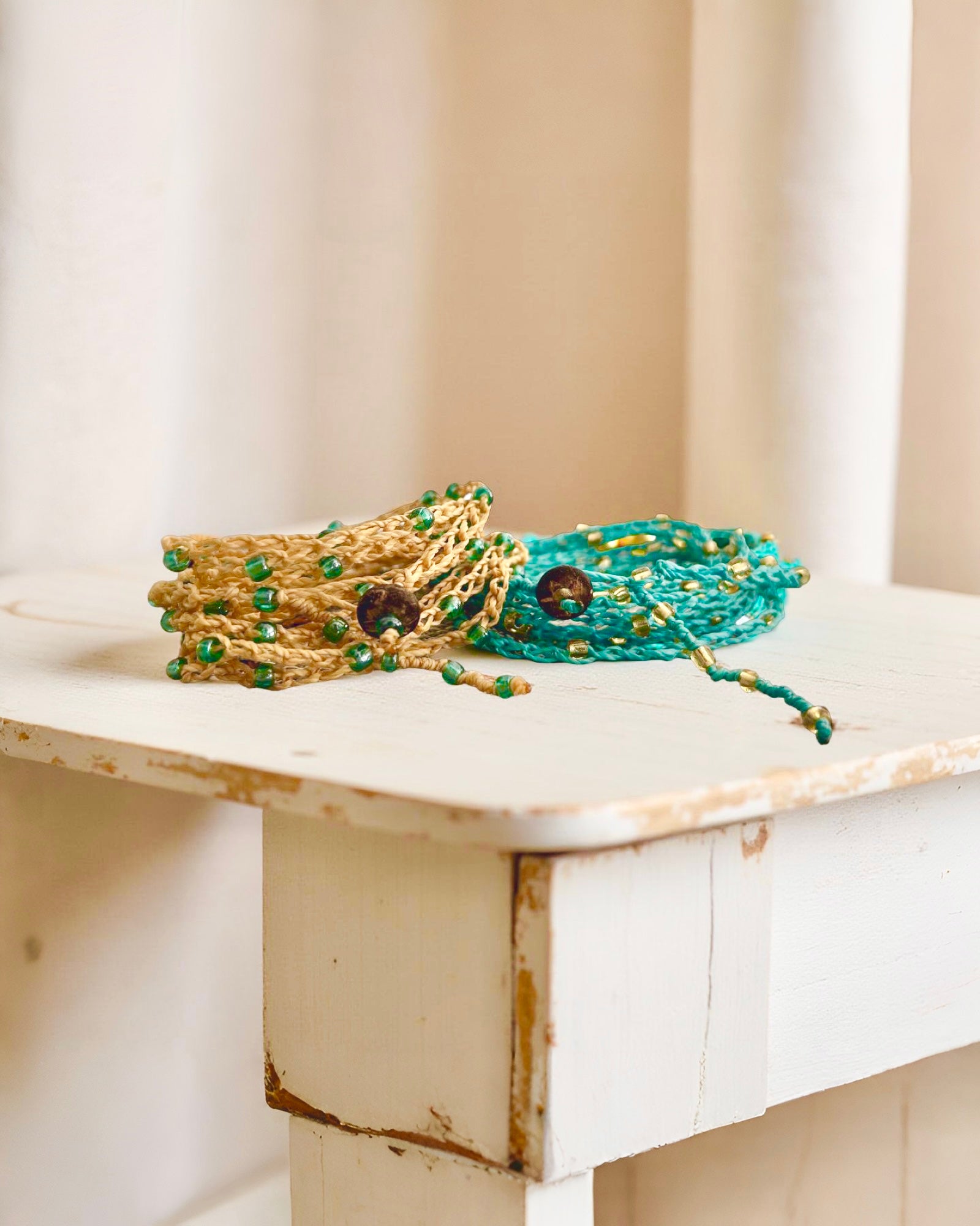Feita à mão em crochê com linha encerada, esta peça singular combina a delicadeza dos cristais de vidro com o charme natural da fibra de coco.